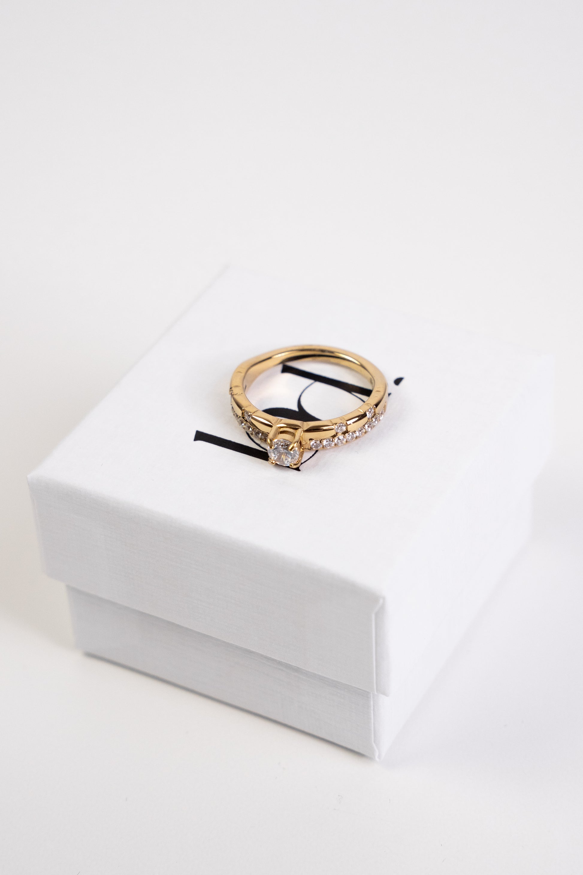 Anel estilo aliança, com zircónias.